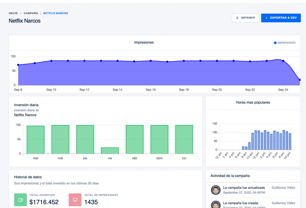 Sabemos gracias a nuestros estudios que los usuarios quieren compartir los resultados y métricas de sus campañas con sus colegas, o sus clientes. Sabemos por experiencia que como usuario es muy desagradable comprar una campaña de publicidad en cualquier medio, y no saber a que hora se reproduce, si se ha impreso o si quiera si se está mostrando del todo.