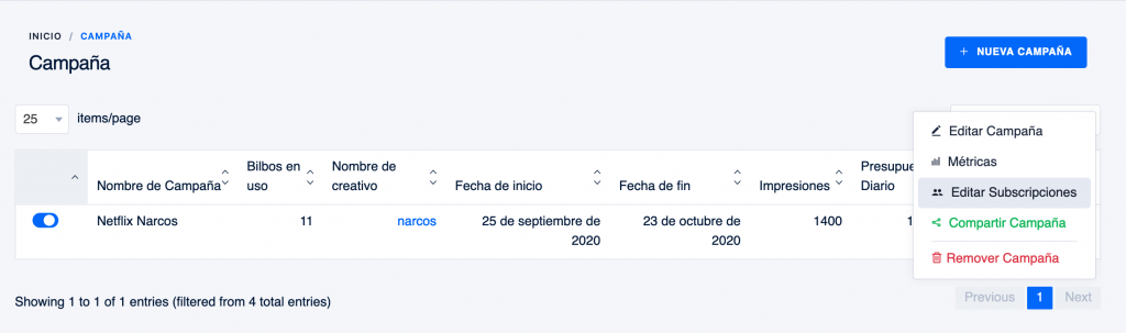 Agregar un nuevo subscriptor a la campaña es sumamente sencillo, simplemente vamos al dashboard de bilbo y buscamos la campaña a la que queremos agregar un nuevo subscriptor. Una vez que la encuentres podrás desplegar el menú de la campaña y verás una nueva opción llamada Editar subscripciones. Después de hacer click en la opción tendrás que introducir el nombre y el número de teléfono del nuevo subscriptor (con código de país. ej +52), una vez que lo introduzcas, el subscriptor recibirá un SMS con la liga a las métricas de tu campaña.